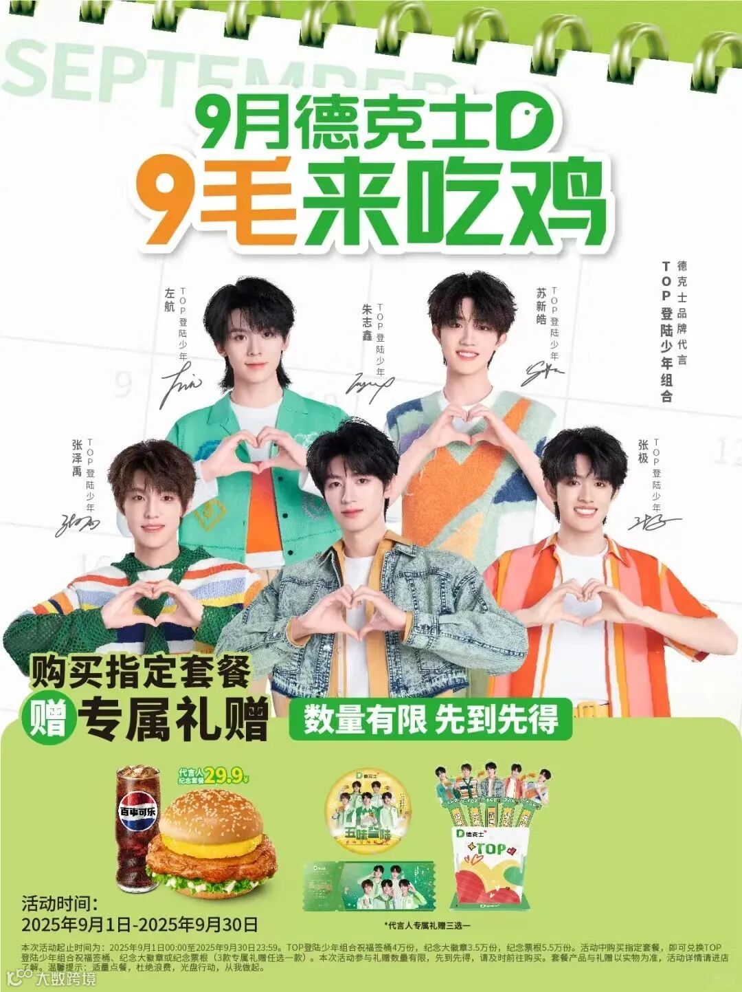9月1日至30日,德克士联合偶像团体“登陆少年”推出限时联名活动。购买指定套餐即可获赠祝福签桶、纪念徽章或票根三款周边之一,吸引粉丝群体打卡消费。