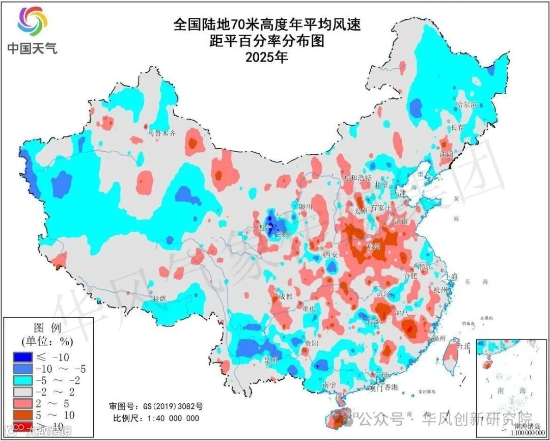图6 2025年70米高度平均风功率密度距平百分率分布图