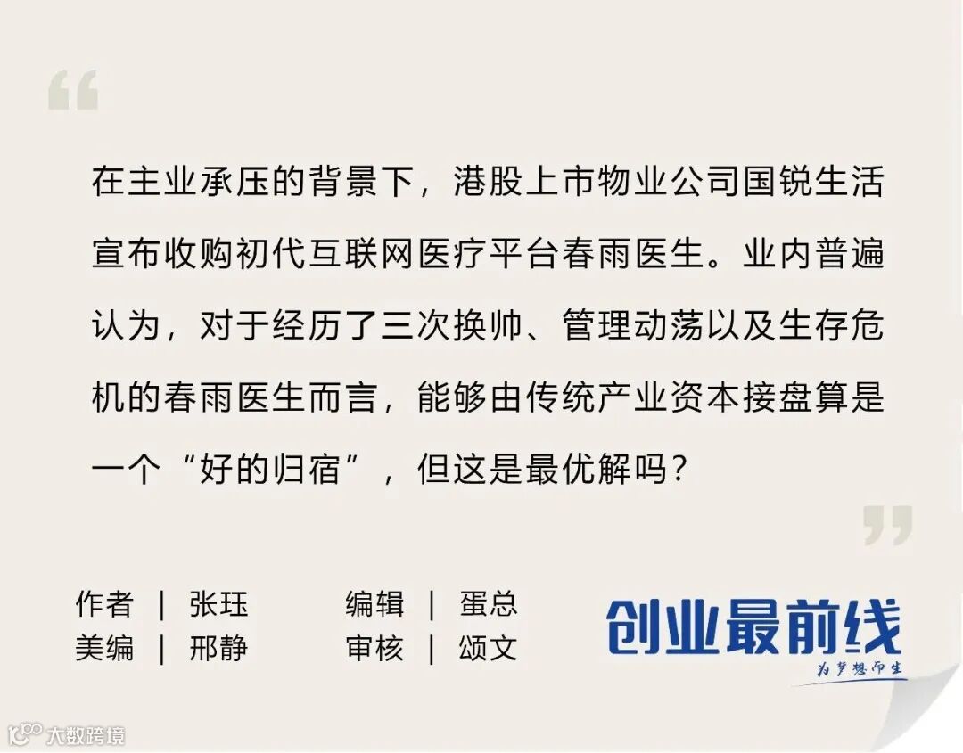 春雨医生被国锐生活收购的消息宣布后,业内普遍认为,对于这家经历了三次换帅、管理动荡以及生存危机的老牌互联网医疗平台而言,能够由传统产业资本接盘算是一个“好的归宿”。