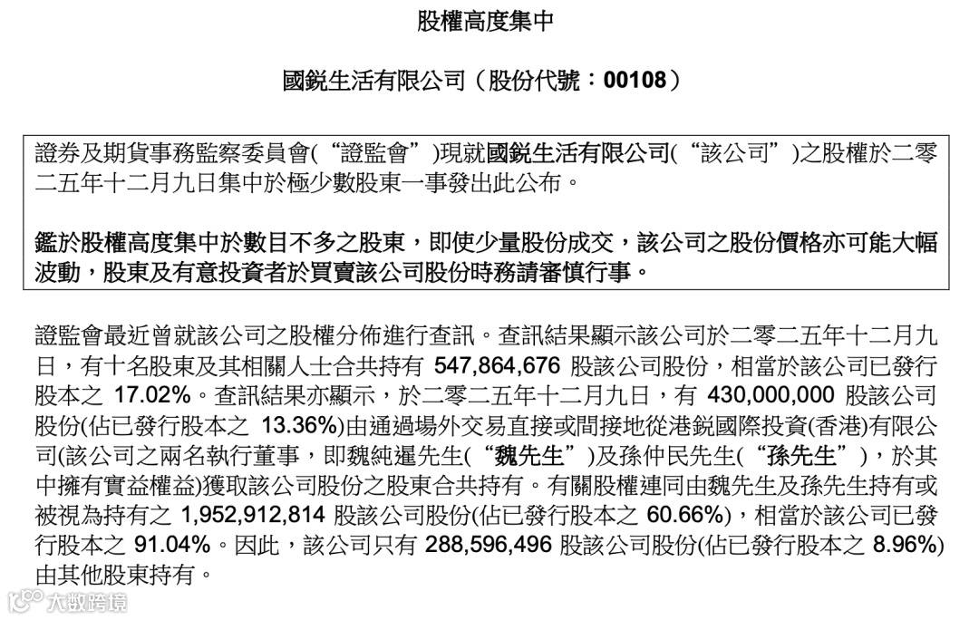 2025年12月22日,香港证监会指出其股权分布高度集中,少数股东合计持股比例高达91.04%,导致公众流通盘不足一成。