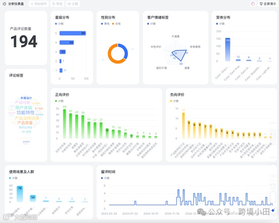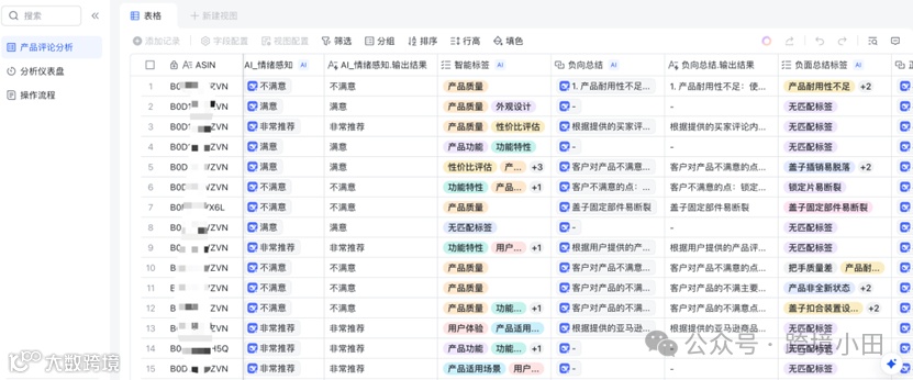 仅需将卖家精灵插件获取的评论内容复制到飞书多维表格模板,即可生成专业报告,支持500条评论以内。