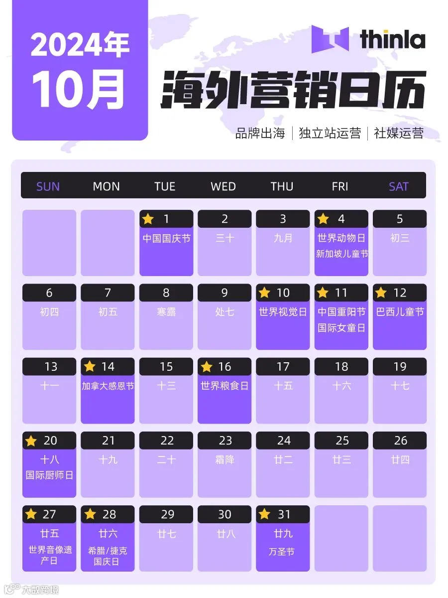 为此,Thinla为大家整理了10月出海营销日历,旨在帮助出海企业迅速掌握营销时机,明确营销策略,并找到适合自己品牌的借势机会,促进销售转化。