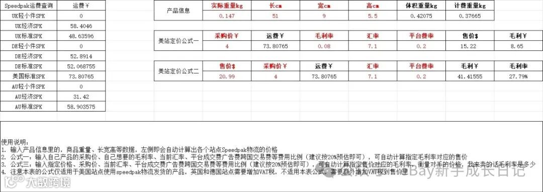 为简化Speedpak运费计算,文中提供自动化表格工具,输入商品重量、长宽高等参数即可自动计算运费,并支持毛利率与售价的双向推算。