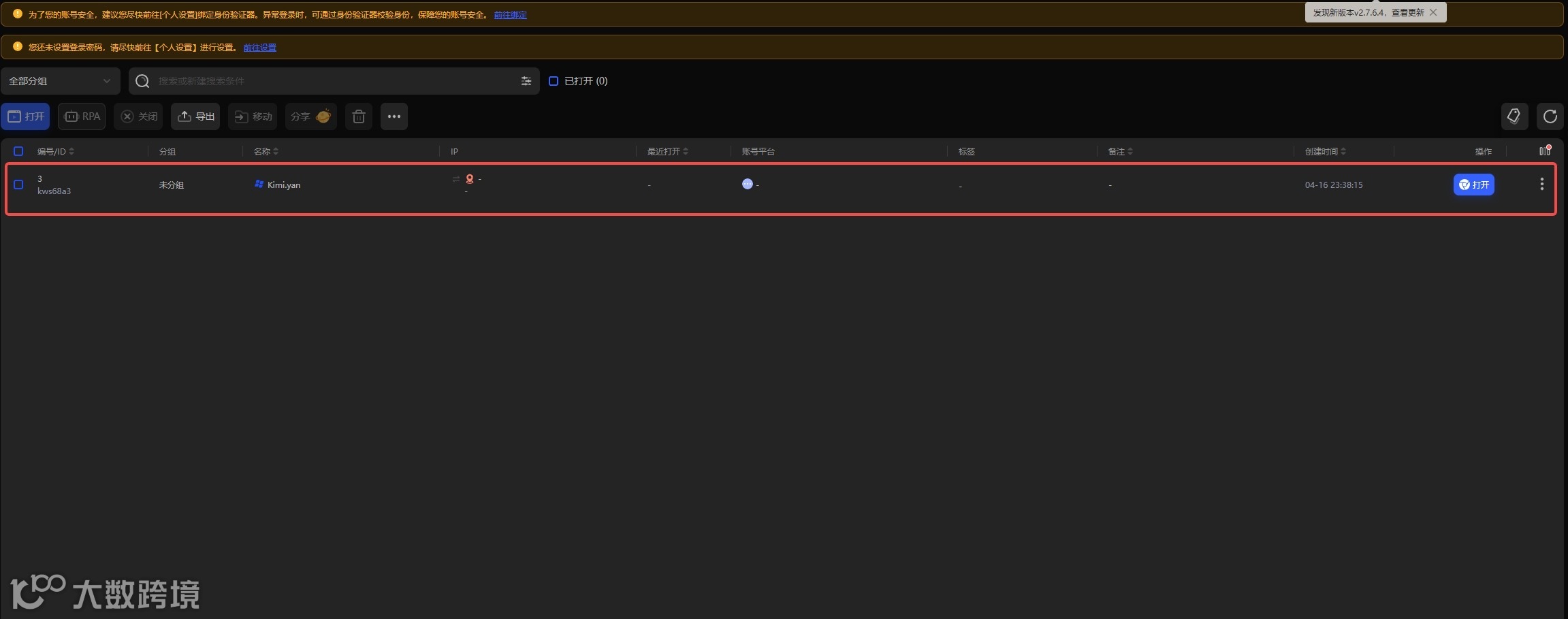 回到 “ 环境管理” 界面 ,找到刚才新建的浏览器环境(如名称为XXX的环境)。在其所在⾏的 “ 操作” 列中 ,点击 “ 打开” 按钮。此时会启动该特定的浏览器环境。