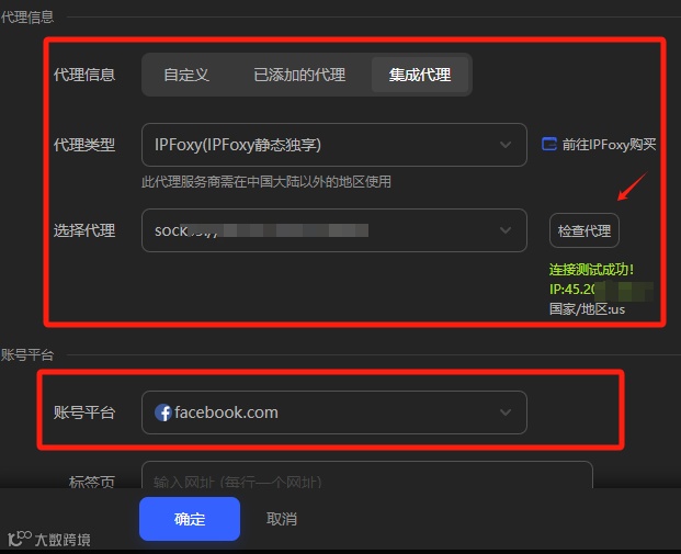 2.配置代理IP,需要是对应的目标市场的IP。(确保访问 FB 时的网络环境符合需求 ,保障账户操作的稳定性和安全性。)