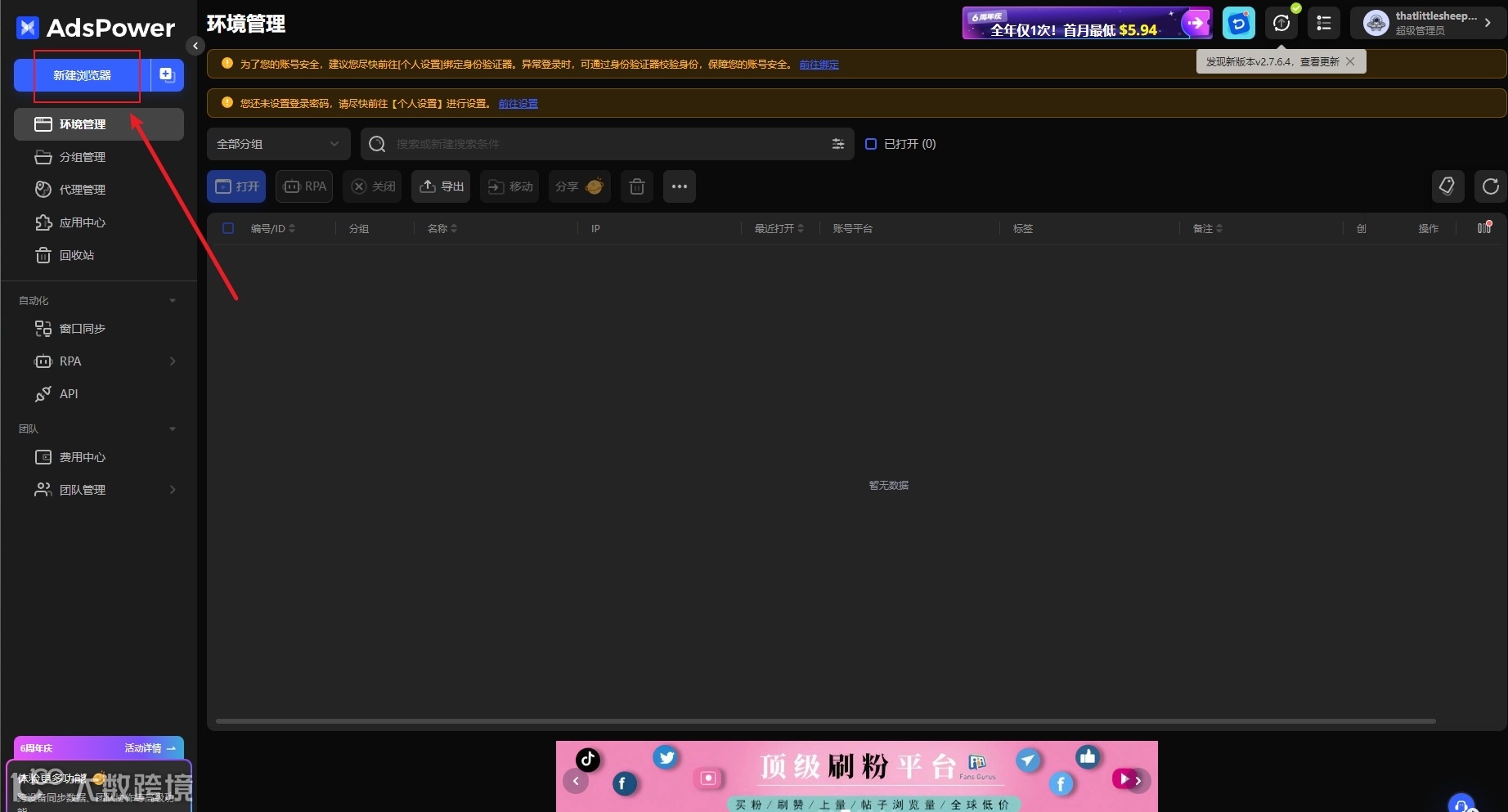 打开 AdsPower 软件 ,在 [环境管理] 界面,点击左上角的[新建浏览器] 按钮。这⼀步是为后续操作创建⼀个特定的浏览环境 ,方便管理和操作广告账户。