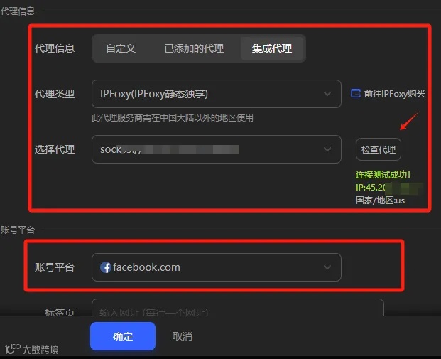 配置完检查代理后,账户平台选 Facebook,其他配置默认后点击确定即可。