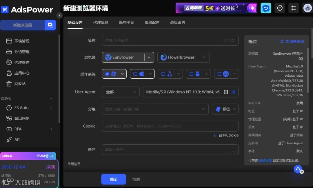 在[新建浏览器环境]页面,进行各项参数配置。填好名称、分组和备注(特别是计划进行多账号投放的企业,方便后续快速锁定每一个账号)