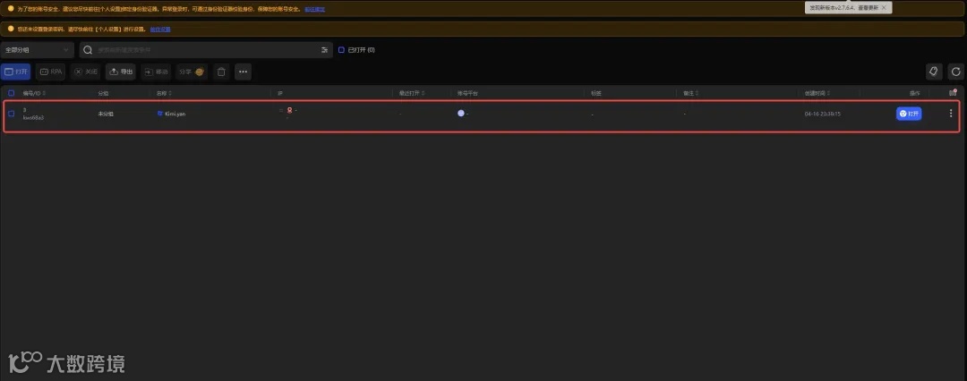 回到 “ 环境管理” 界面 ,找到刚才新建的浏览器环境(如名称为XXX的环境)。在其所在⾏的 “ 操作” 列中 ,点击 “ 打开” 按钮。此时会启动该特定的浏览器环境。