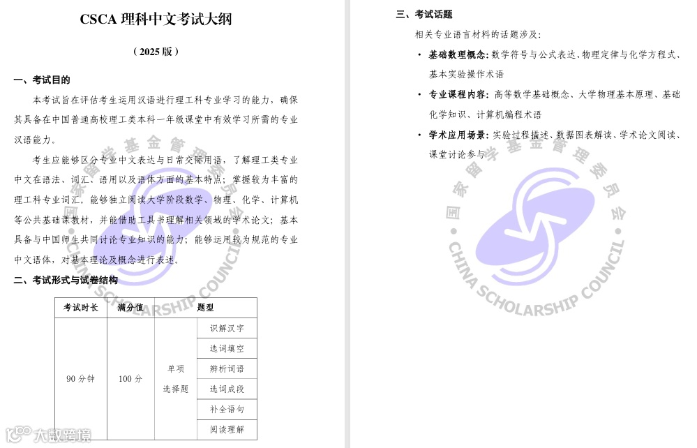 可参考 CSCA 文科中文、理科中文、数学、物理、化学考试大纲,咨询鹳君来华获得测试模拟。