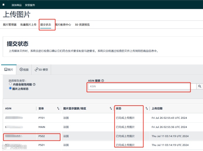 🔸 若您上传的是产品安全图片(PS01-PS06),请前往任意一个欧盟站点>目录>上传图片>提交状态>输入对应的ASIN>查看上传状态是否已完成上传图片,且图片代码为PS01-PS06。