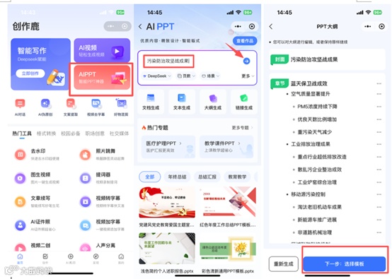 进入小程序,点击【AIPPT】,接着选择一个主题进行描述,点击旁边的键进入,等待一会,PPT大纲就出来了,下一步点击【选择模版】。