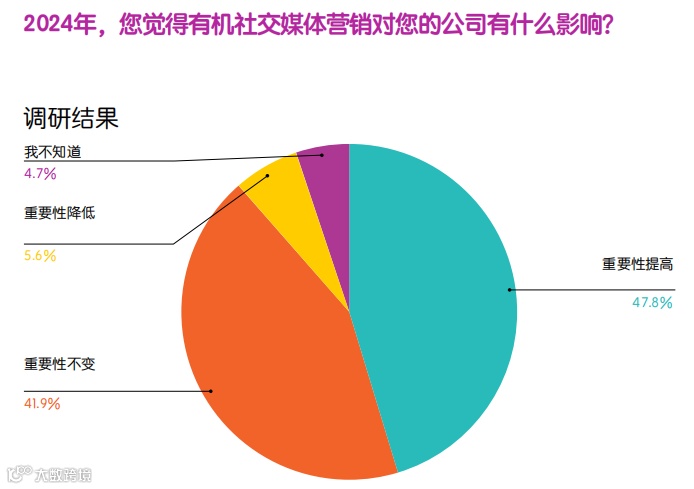 亚太地区47%的受访者表示,2024年社交媒体营销将在推动业务增长的过程中发挥更大的作用,仅仅只有5%的受访者认为社交媒体营销的重要性将会下降。
