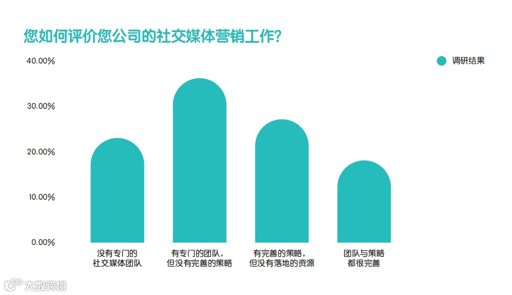 虽然理论上,品牌都很容易理解社交媒体营销的重要性,但从执行层面上而言,推动制胜战略落地的过程中始终存在差距。34%的受访者表示,虽然拥有专门的社交媒体营销团队,但仍然缺失专门的营销战略,而25%的受访者则表示处境更加困难,就算制定了战略,但缺乏执行战略的资源。
