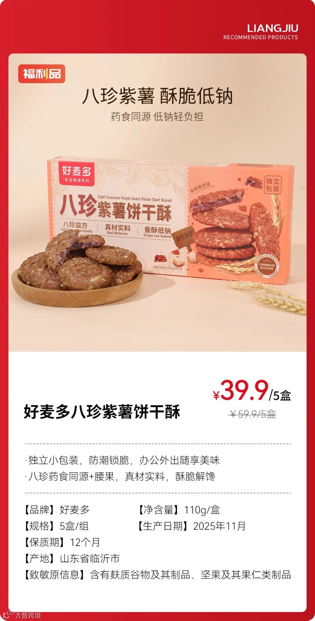 【配料表】小麦粉、食用植物油、白砂糖、紫薯粉、腰果碎、燕麦片、八珍粉(怀山药(山药)、茯苓、薏苡仁、莲子、芡实、猴头菇、白扁豆、陈皮)、白芝麻、碳酸氢铵、食用盐、特丁基对苯二酚、食用香料