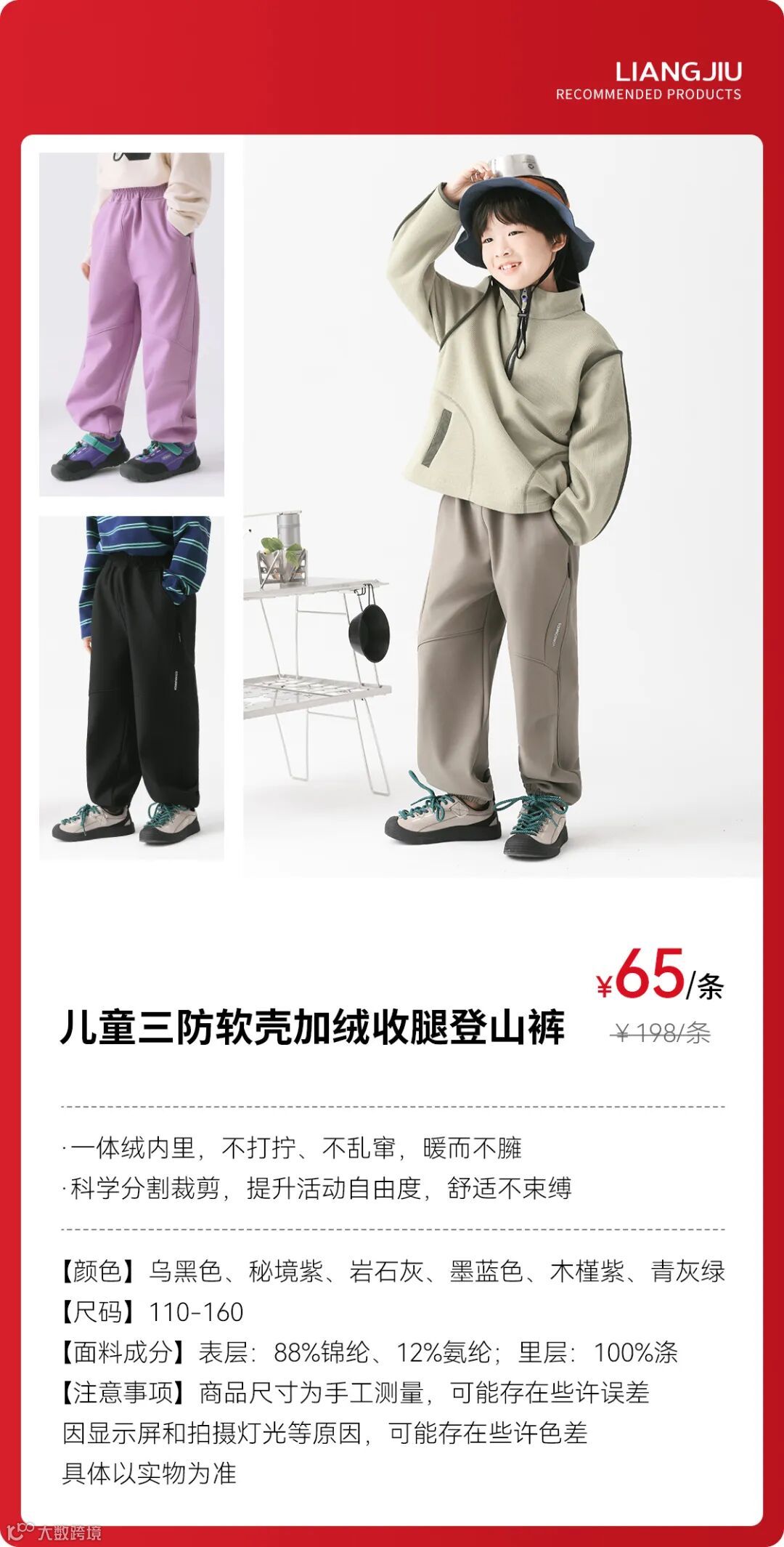 儿童三防软壳加绒收腿登山裤