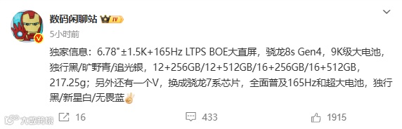 中端机往往比旗舰机更激进,一加这次给出的亮点就是165Hz超高刷和9000mAh大电池,同档位对标红米Turbo5、荣耀GT2系列。