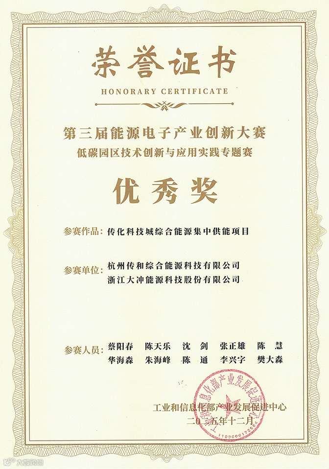 在这场汇聚全国顶尖能源创新力量的赛事中,杭州传和综合能源科技有限公司申报的《传化科技城综合能源集中供能项目》凭借其多能互补协同优化、智慧能源管控与深度节能降碳的创新实践,从全国百余个参赛项目中脱颖而出,荣获优秀奖。