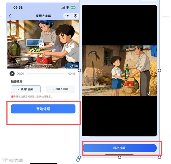 然后点击【开始处理】,稍等一会会就生成好了,一段去完字幕的视频就做好啦,点击查看并选择导出视频,就可以保存到手机相册里。