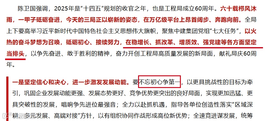这一年,是中建三局成立60周年。在2025年初举行的会议上,中建三局党委书记、董事长陈卫国就明确提出,要在稳增长等各方面坚定当排头,“不忘初心争第一”。