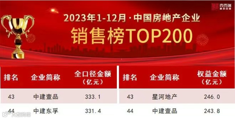 而在第三方机构克而瑞发布的榜单中,中建壹品2023年的全口径销售额为333.1亿元,比“老大哥”中建东孚高出近2亿元,一跃成为“中建八子”中的第一。