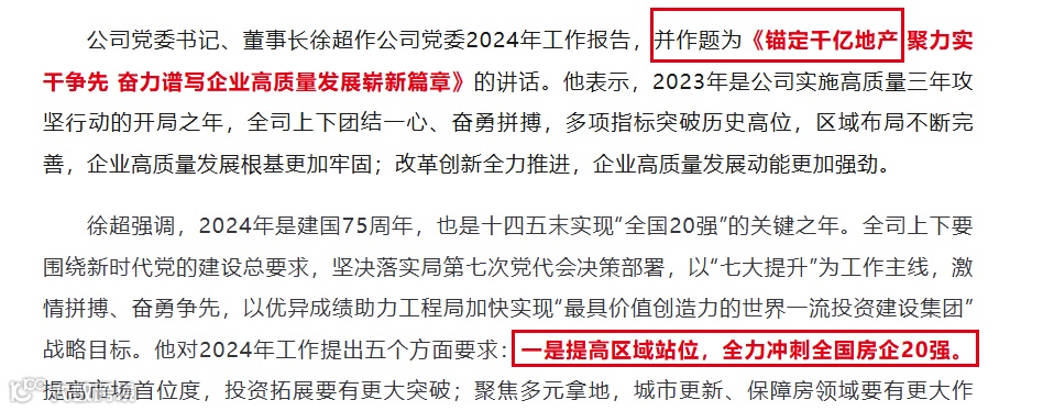 在2024年1月举行的中建壹品党委一届二次全体(扩大)会、一届二次职工代表大会、2024年工作会议上,徐超在讲话标题中就明确了“锚定千亿地产”目标,要求“全力冲刺全国房企20强”。