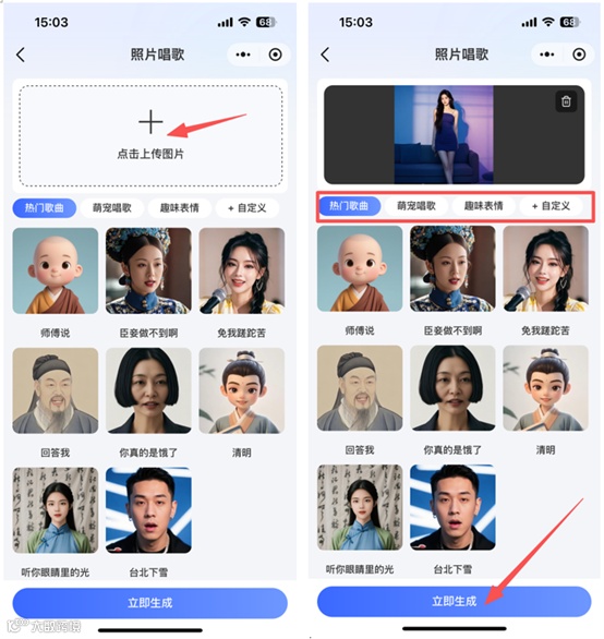 接着上传一张合适的参考图,其中有很多风格和 应用场景可供选择,选择自己想要的风格,点击【立即生成】就可以啦!