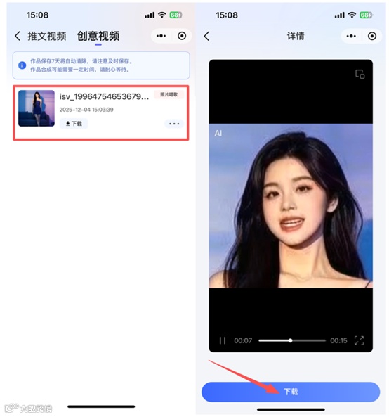 最后,等待一会视频就生成好了,可以点击查看生成的效果后,下载保存到相册即可。