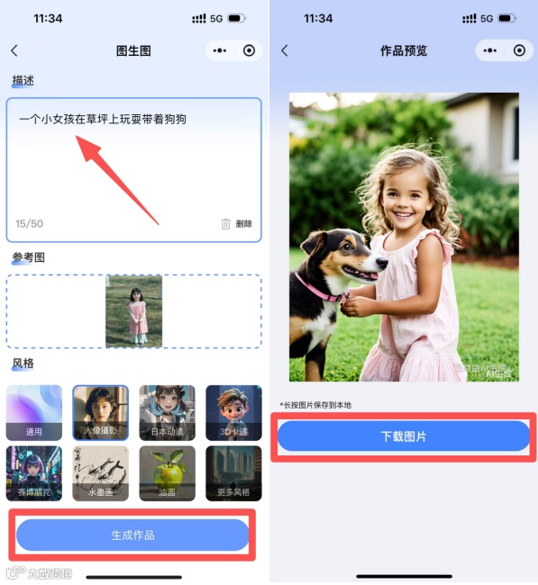 根据主题描述一下主体场景越详细越好,接着上传一张合适的参考图,点击【生成照片】,后面就可以把这张照片下载保存到相册即可。