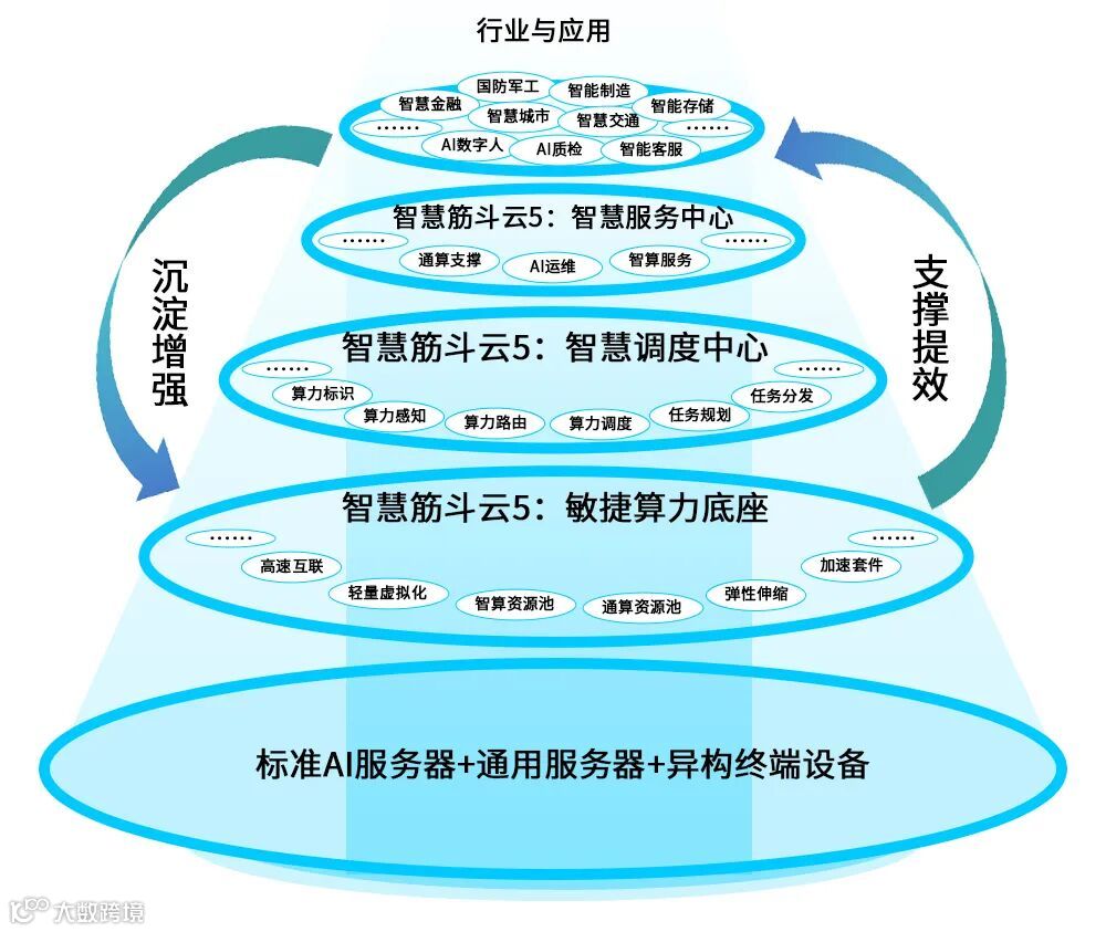 随着用户市场对于AI算力及算力应用的需求,智慧筋斗云正在逐步推出5.0版本,增加数据中台、模型库、模型训练、模型应用中心等面向AI算力使用的一体化服务。依托智慧筋斗云“小边大端”战术级场景的敏捷部署能力,结合“多元算力融合”与“算力效能提升”等特点,实现边缘计算+AIGC式服务能力的有机结合,帮助用户构建门槛低、效能高的一体化敏捷级智算底座。