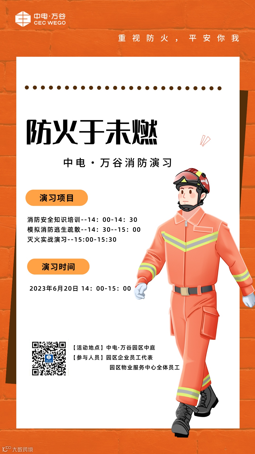 安全是生命之本,为加强园区的消防安全管理,进一步提高企业员工消防安全意识,增强园区各租户业主处理消防突发事件的能力,提升园区企业人员的消防自救逃生技巧,中电·万谷园区物业服务中心拟定于2023年6月20日14:00- 15:00在园区组织消防逃生模拟演习。