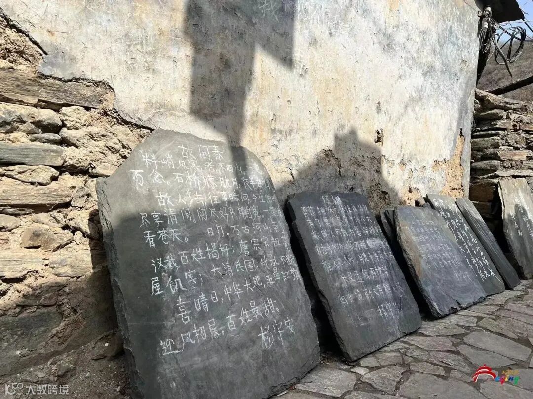 沿着水峪村古街前行,在一条长约二百米的小巷里,摆放着许多写着白色粉笔字的青灰色石板,上前细看,字迹工整,内容多是诗歌,署名均为杨守安。