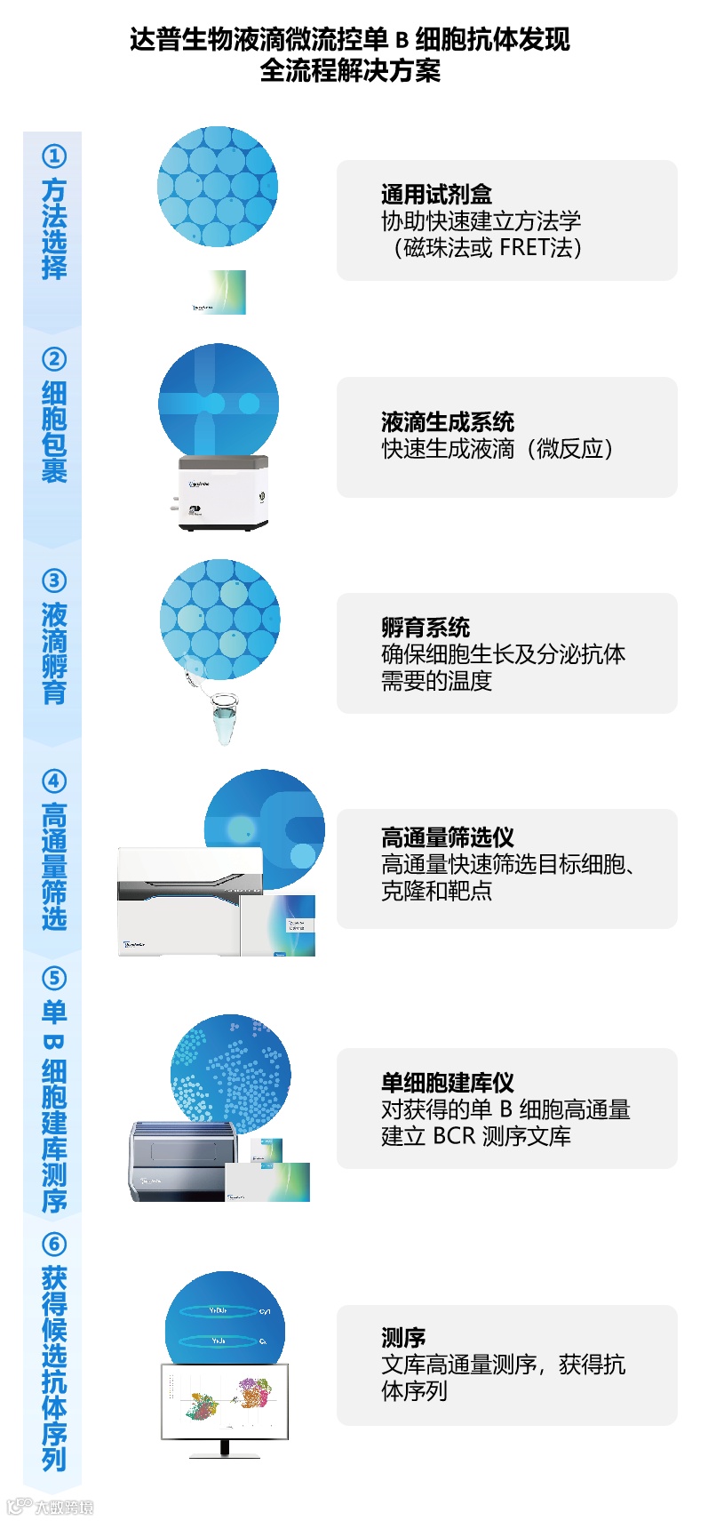 液滴微流控是近年来微流控领域的一个重要发展分支,该技术将每一个微液滴视为一个独立的反应器,可实现大规模的反应检测与筛选。基于液滴微流控的分选技术,单次实验可以处理 106 个浆 B 细胞,且使用的耗材设计简单、生产产业链成熟。整体来说,具有通量高、成本低、操作简单等优势。在单 B 抗体发现领域具有巨大潜力。但目前,成熟商业化的仪器平台仍然较少,市场潜力有待铺垫。