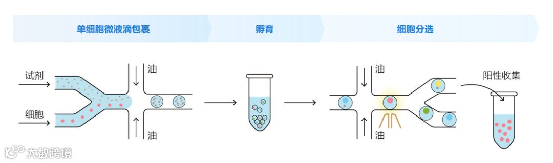 分选原理:将单细胞与检测试剂包裹成油包水液滴,短暂孵育后,系统基于液滴荧光信号,通过介电泳力对油包水液滴进行分选。