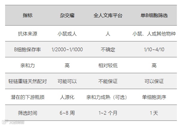 全人文库平台与单 B 细胞筛选技术相比,全人文库平台有以下两种问题:全人文库平台中筛选得到的抗体,由于未经过体内的抗体成熟过程,所筛选出的抗体序列往往亲和力有限,需要建立单点突变文库完成亲和力成熟,这意味着进行二次大规模的筛选,增加了工作量;其次,由于文库平台中抗体重链和轻链随机组合,无法保持抗体重链轻链的天然配对。由此可见,利用全人抗体文库来进行抗体筛选,成功的随机性较高。