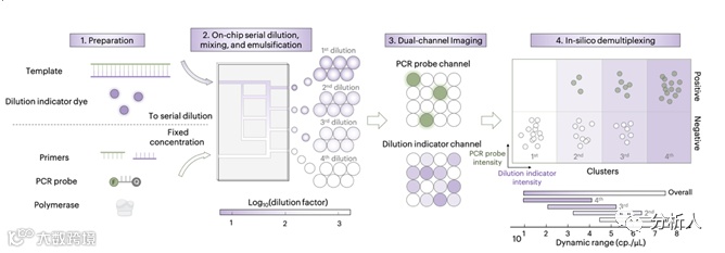 数字 PCR(dPCR)技术由于其绝对定量的能力和极高的灵敏度,被广泛的应用于分子诊断领域。然而,与目前的金标准定量 PCR (qPCR)相比,dPCR 在动态范围方面落后了 3~4 个数量级,这极大地限制了其在临床领域的应用。例如,对一些载量范围波动较大的病毒感染样本进行定量时,高载量的样本往往会使 dPCR 显全阳性而无法通过泊松分布定量。因此,亟需开发一种比目前的 dPCR 动态范围更大且简便易用的新的 dPCR 策略。