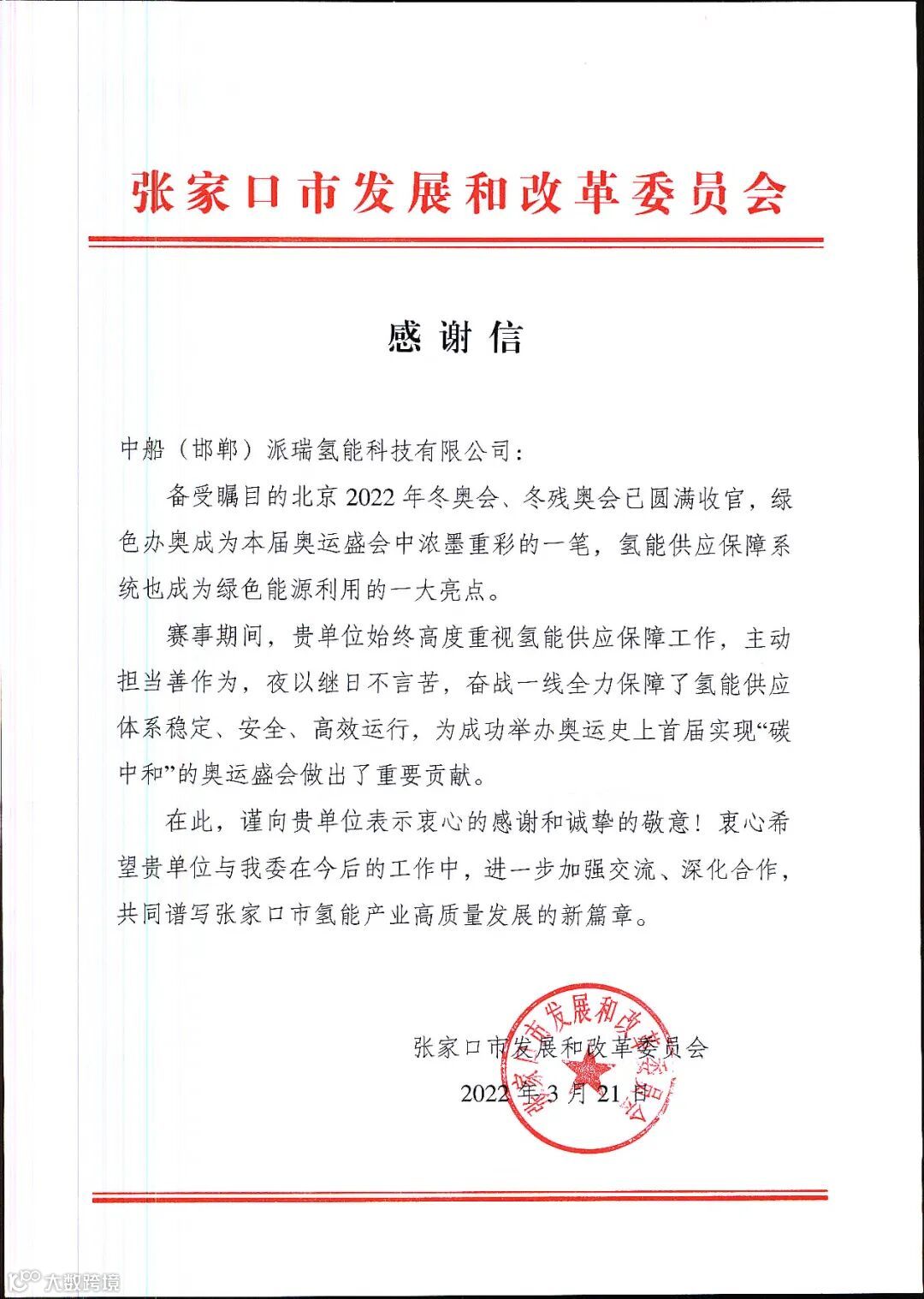 信中感谢了派瑞氢能公司高度重视冬奥会氢能供应保障工作,主动担当善作为,夜以继日不言苦,奋战一线全力保障氢能供应体系稳定、安全、高效运行。高度赞扬了派瑞氢能公司为成功举办奥运史上首届实现“碳中和”的奥运盛会做出的重要贡献。