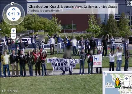 都说有钱任性,当谷歌的员工也够任性的。这个叫 Michael 的家伙显然觉得普通的求婚太过无聊,干脆就把自己的同事叫到外头,等着谷歌街景车开过来的时候,大家一起招手,他自己则打起了“嫁给我”的横幅。