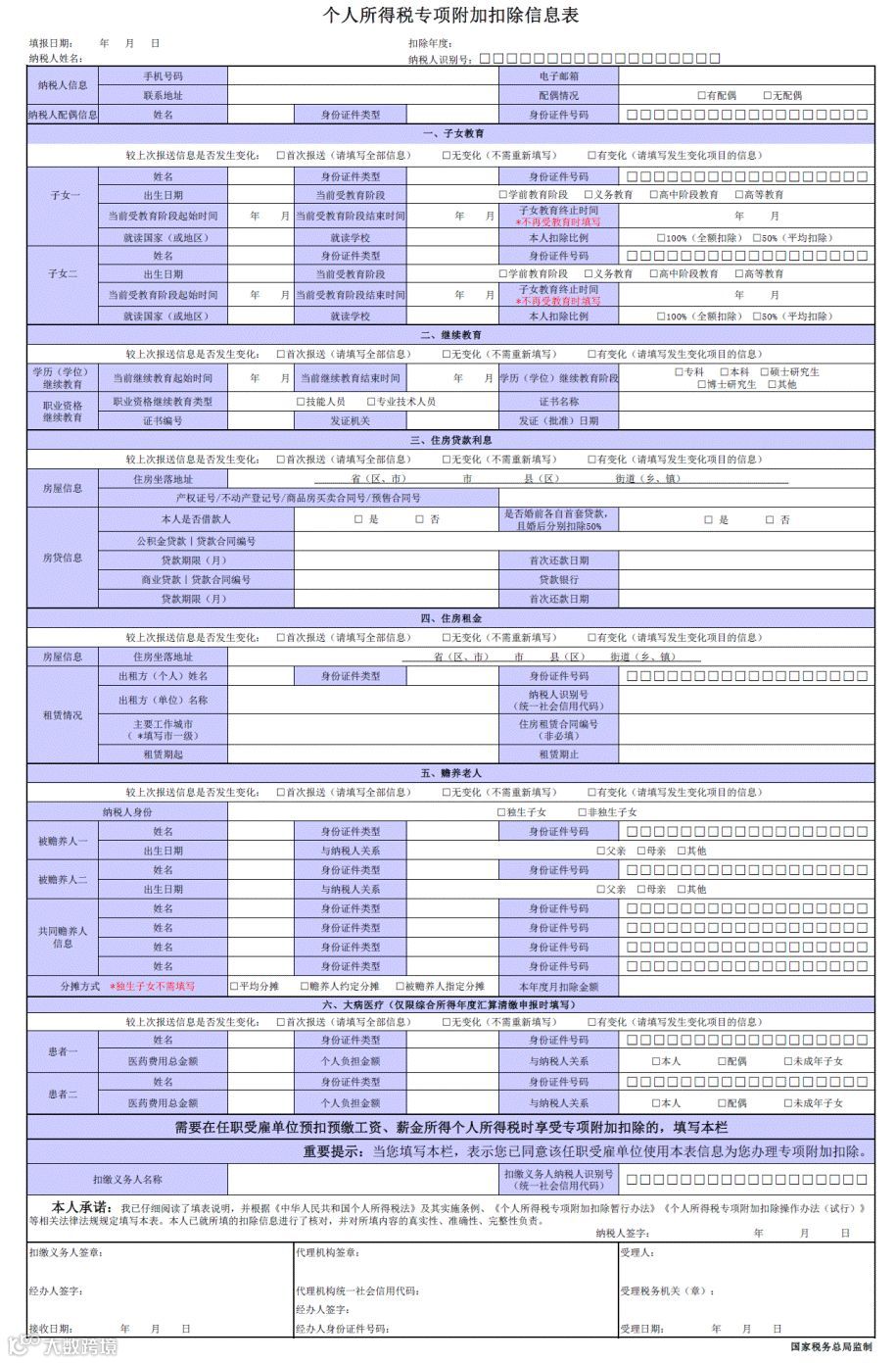 (二)纳税人首次填报专项附加扣除信息时,应将本人所涉及的专项附加扣除信息表内各信息项填写完整。纳税人相关信息发生变化的,应及时更新此表相关信息项,并报送至扣缴义务人或税务机关。
