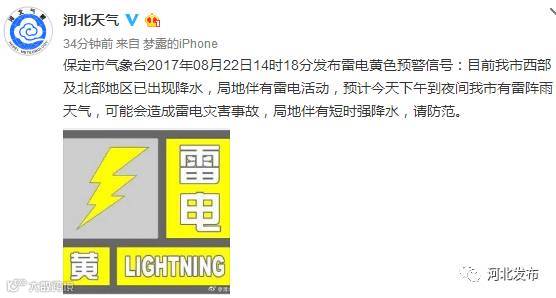 保定市气象台2017年08月22日14时18分发布雷电黄色预警信号:目前我市西部及北部地区已出现降水,局地伴有雷电活动,预计今天下午到夜间我市有雷阵雨天气,可能会造成雷电灾害事故,局地伴有短时强降水,请防范。