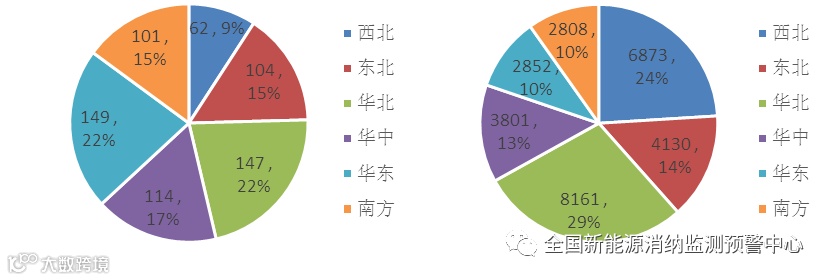 一季度各区域新增(左)、累计(右)并网光伏发电装机(万千瓦)