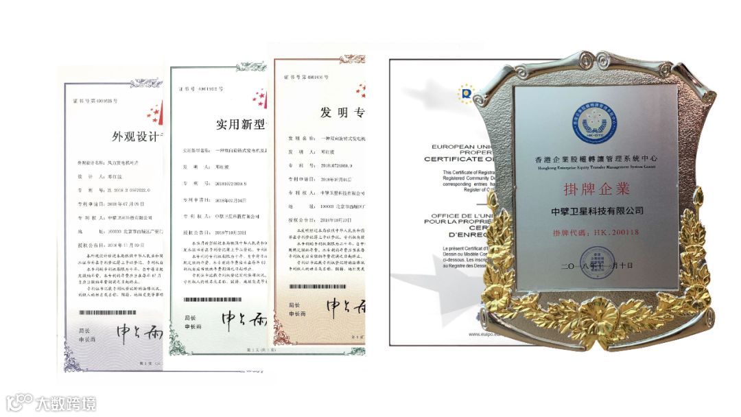 中擘卫星科技有限公司在2014年开始研发工作,公司以先进的风机设计理念,不断创新的设计技术,凭借着世界唯一的“两项驱动一体化发电设备”完成了30余项的专利申请,其中「201810724869.9」号(双向旋转式发电机及其发电方法)专利更是被认为挑战世界科学禁锢,被称为19世纪发电机诞生的一次革命!国内,获得国家知识产权专利证书分别有:外观专利证书、实用新型专利征税以及发明专利证书!国际,获得德国电机认证、以及欧盟的专利认证等。目前增值股已在香港新三板上市,股号【HK200118】