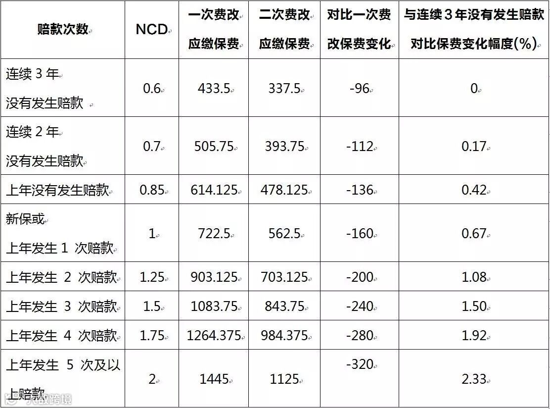 上表可以看出:与连续3年没有发生赔款对比,上年发生赔款2次的保费上浮1.08%、3次的上浮1.5%、4次的上浮1.92%、5次的上浮2.33%!