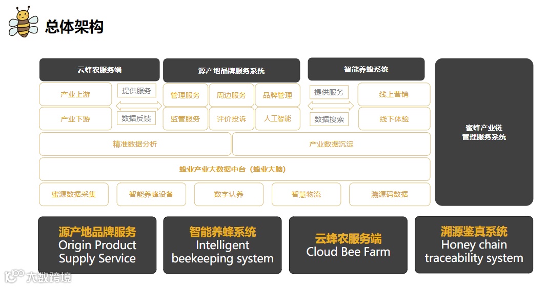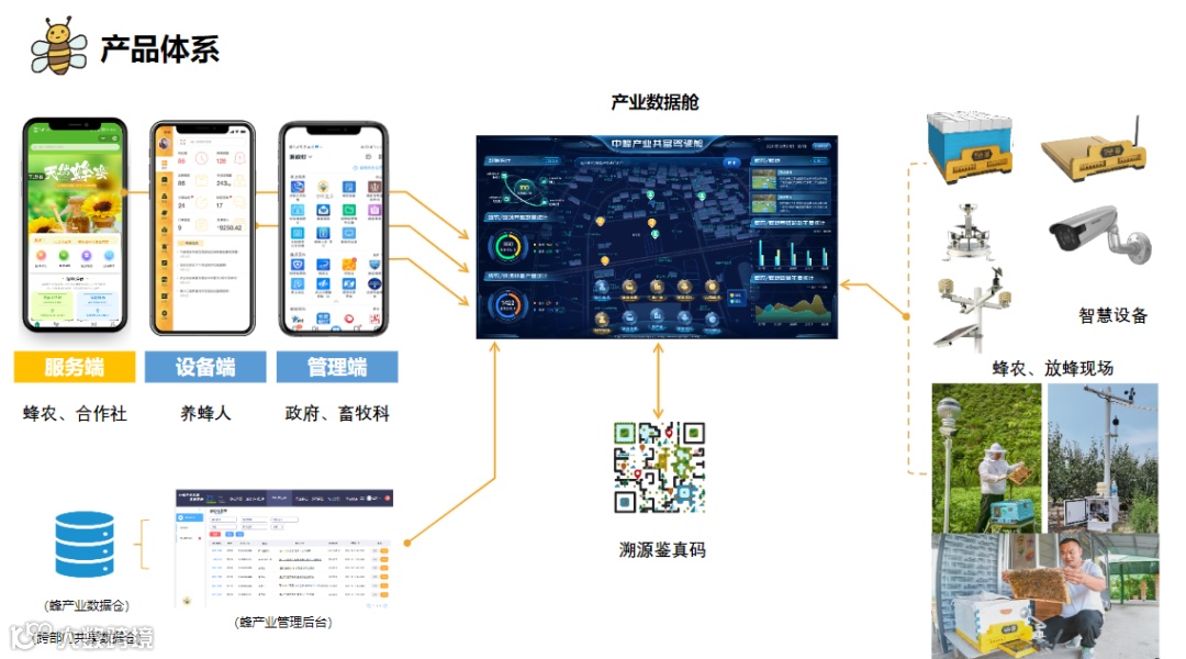 其中,中蜂共富产业数字化平台以提升蜂产业标准化和自动化水平为目标,综合应用物联网、3S、人工智能等信息技术开展中蜂全产业链智能管控。在蜂产品质量控制、中蜂行为监测识别、数字蜂场管理、蜂业大数据分析等方面开展技术攻关,构建了智慧蜂场、智能蜂箱、蜂产品质量追溯、蜂产业大数据中心、蜂业知识服务等产品,实现了蜂业全产业链信息采集、智能管控、辅助决策等数字化服务,携手共建智能化、生态化、无人化的现代蜂业经营管理模式。