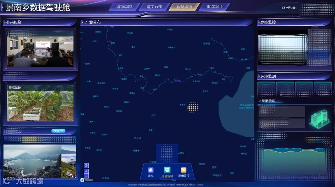 景南乡大数据运行平台运用新一代信息技术因地制宜、循序渐进的科学化把握乡村的特色和发展走势,并依托村内地理优势及现有资源,运用“城镇风貌、数字五美、智慧城镇、重点项目”四大模块促进产业项目的智慧化转型,发展绿色环保生活方式,加强全镇精神文明建设,为统筹城乡融合打下扎实基础。