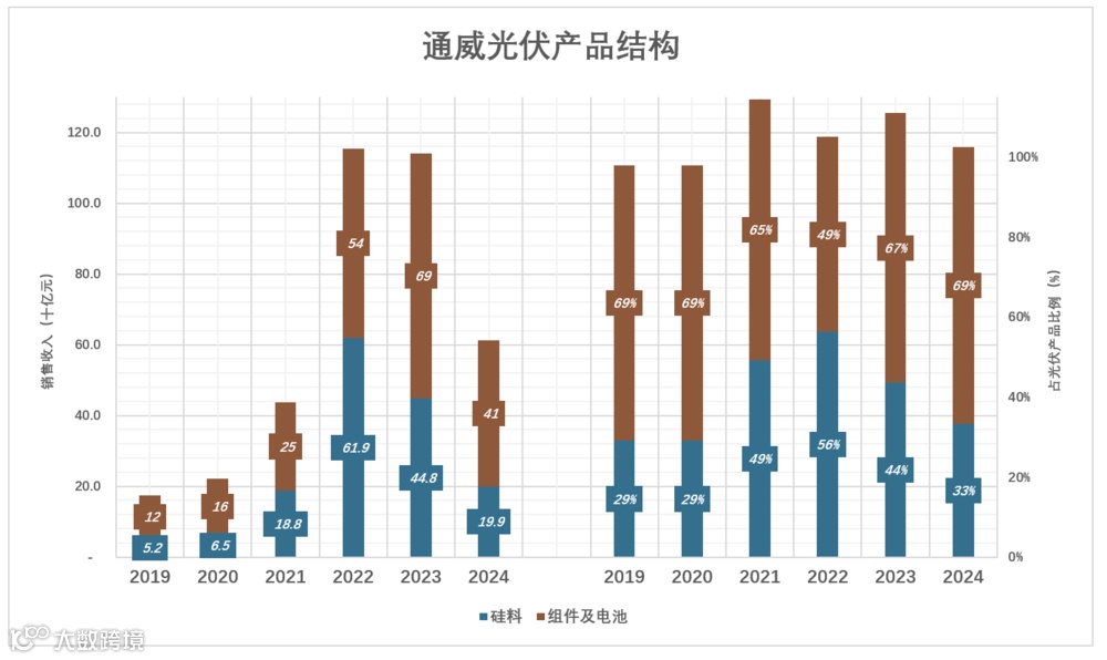 2024年,硅片收入暴跌62%、至166.5亿;组件收入亦跌37.6亿、至58.1亿;因组件收入跌幅相对小,占比提升至25.9%;