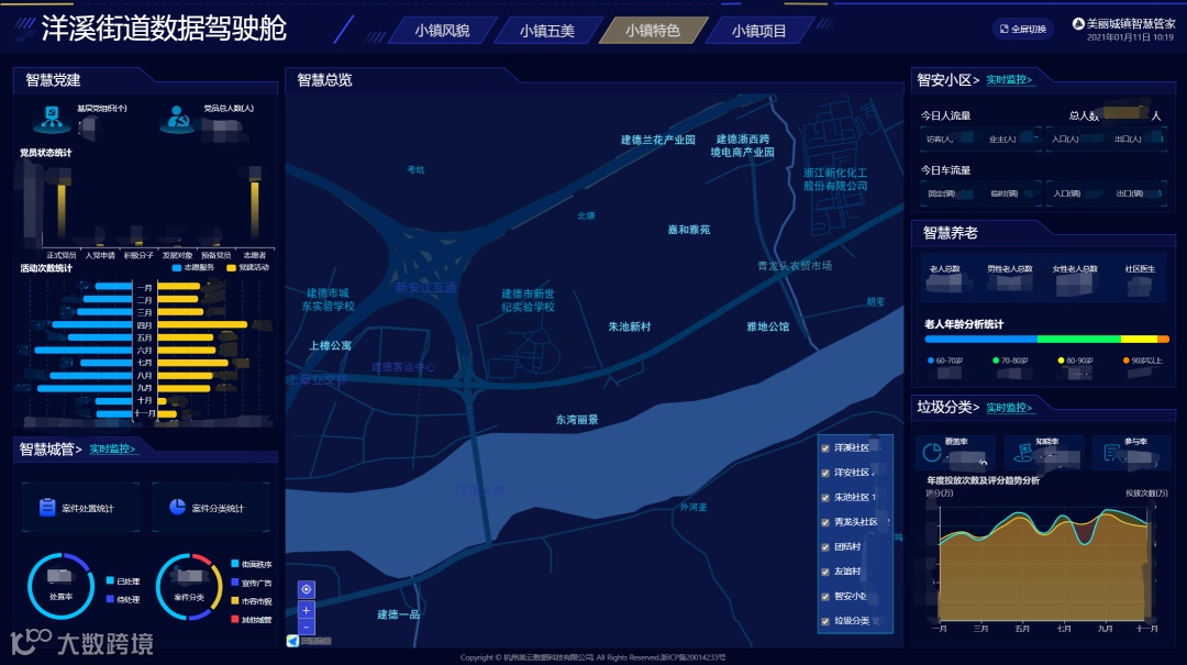 2.智慧洋溪,数据可视化更替为智慧城管、垃圾分类、智慧小区、智慧养老及监控拉流,地图增加小区信息展示;