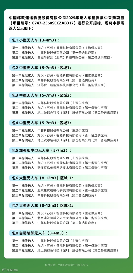 商业化落地层面,九识智能再添重量级合作。中国邮政速递物流股份有限公司2025年无人车租赁集中采购项目结果显示,九识智能凭借领先的技术方案与成熟的运营经验,成功包揽项目全部标段,并在第1、2、6、7四个核心标段中以绝对优势当选主供应商。此次合作标志着九识智能正式成为中国邮政无人运力体系的核心合作伙伴,实现了全球顶尖自动驾驶科技与中国"国家队"物流网络的深度融合。