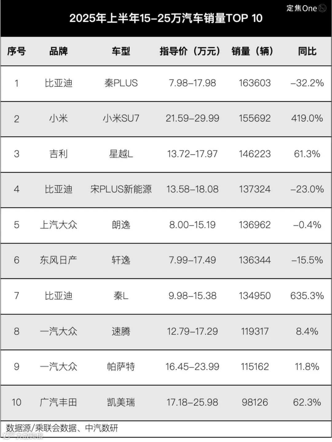 有意思的是,当我们把2025年上半年的销量数据按价格带分析时,会发现各个区间呈现出不同的竞争逻辑和发展趋势。
