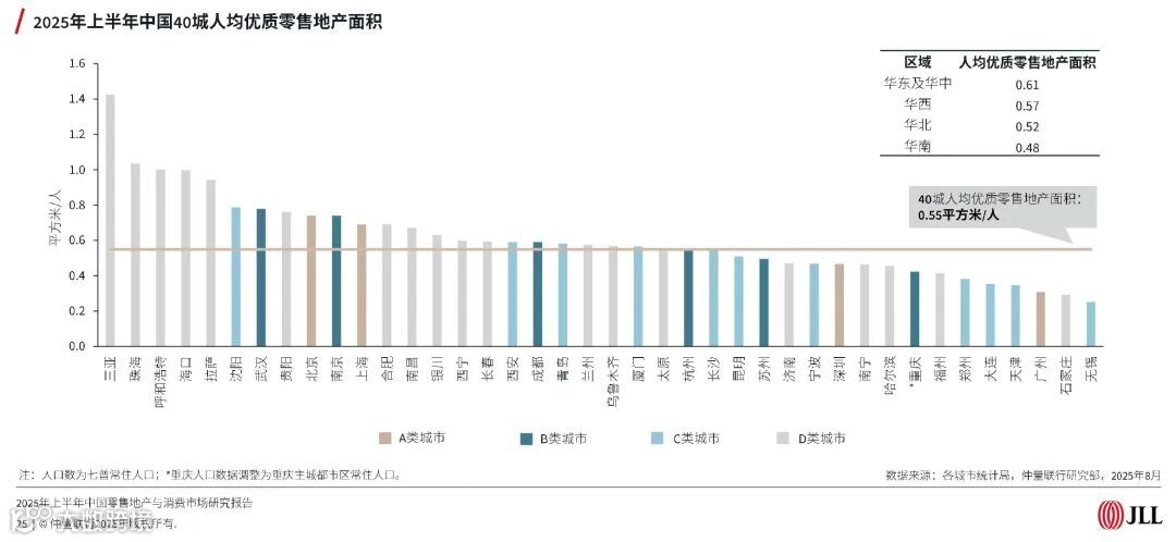 从数据上看,今年前三季度,青岛社消零达4990.6亿元,居于“北方消费第二城”;而济南则为4009亿元,二者差距明显。而具体到商业表现上,根据仲量联行发布的《2025年上半年中国零售地产与消费市场研究报告》,青岛人均优质零售地产面积同样明显高于济南。